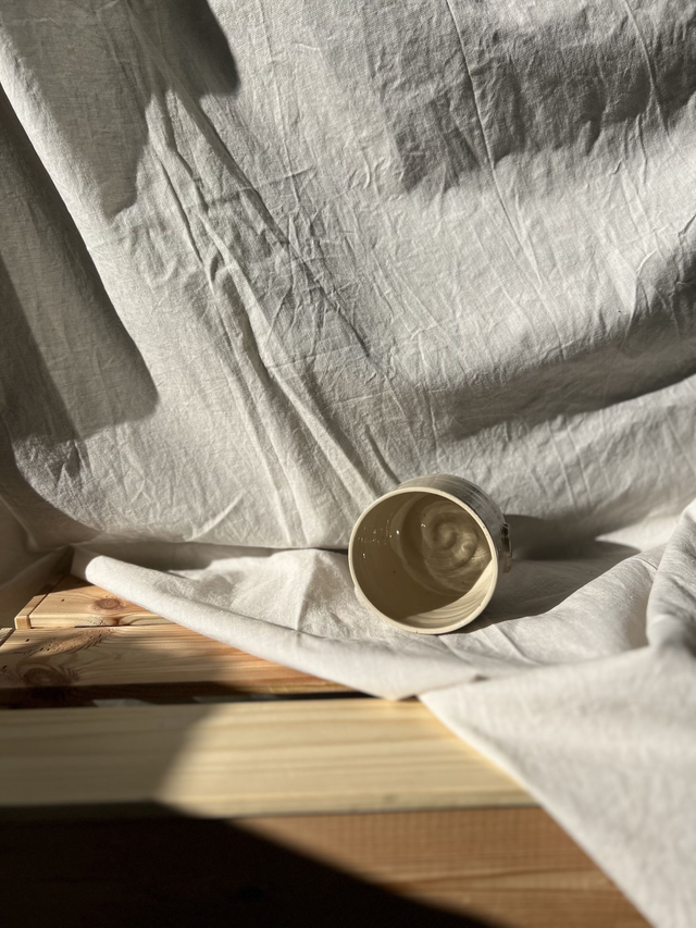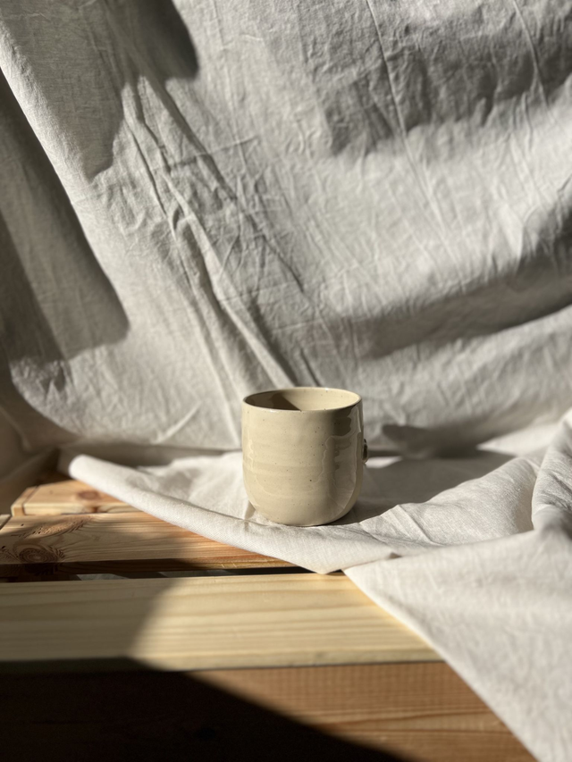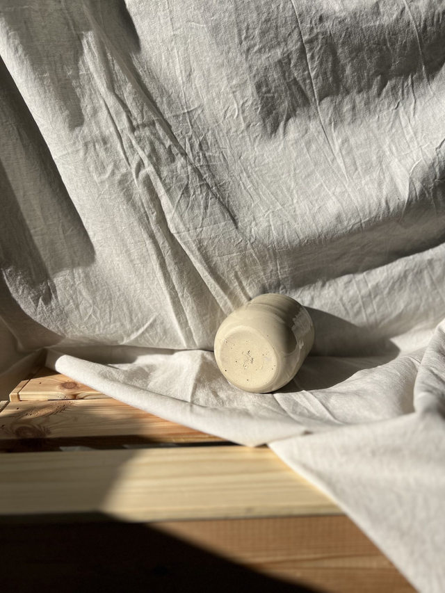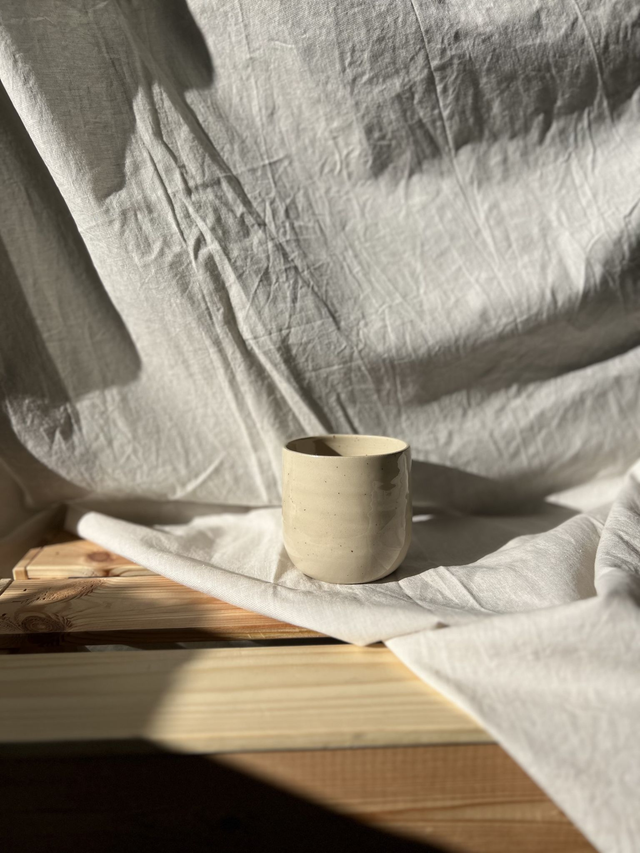 Diese Becher wurden auf einer Töpferscheibe handgefertigt, dabei wurde hochwertiger, heller Steinzeugton mit Spots verwendet. Durch den hohen Brennvorgang bei 1220 Grad Celsius sind alle Produkte spülmaschinengeeignet.