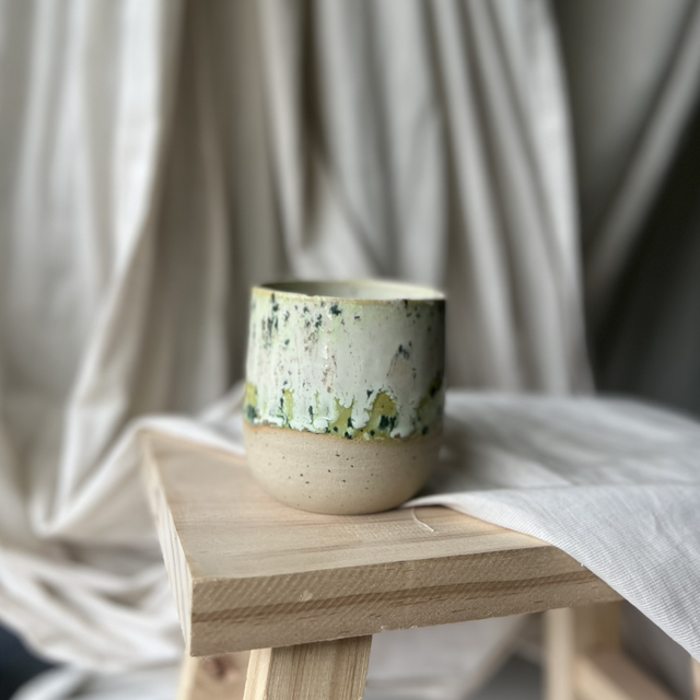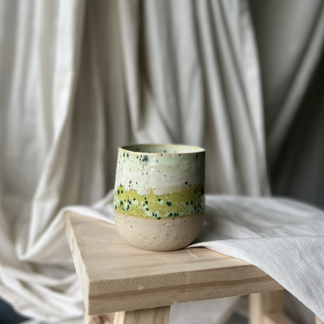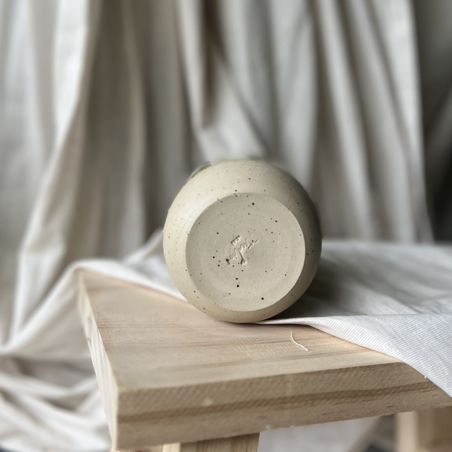 Diese Becher wurden auf einer Töpferscheibe handgefertigt, dabei wurde hochwertiger, heller Steinzeugton mit Spots verwendet. Durch den hohen Brennvorgang bei 1220 Grad Celsius sind alle Produkte spülmaschinengeeignet.