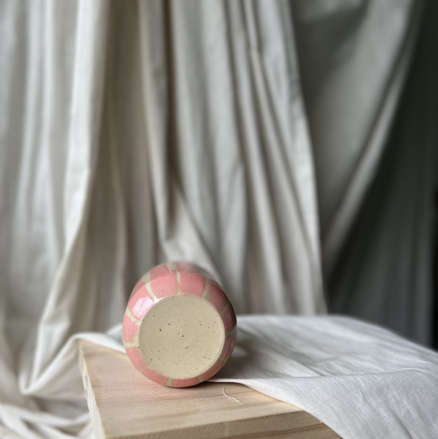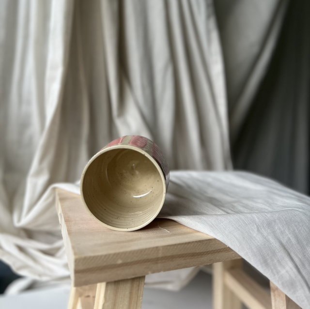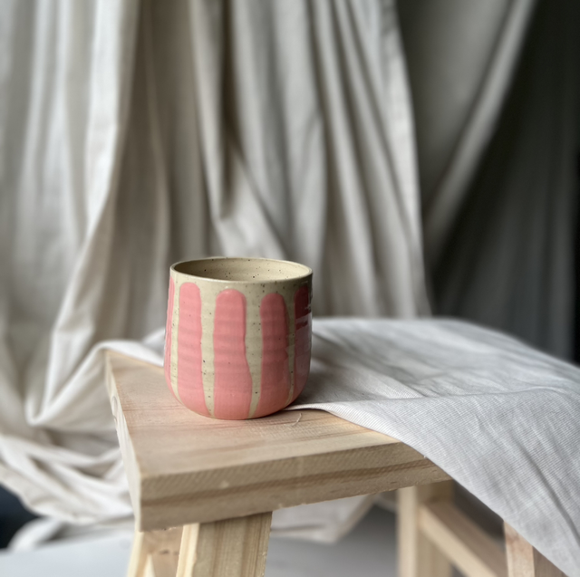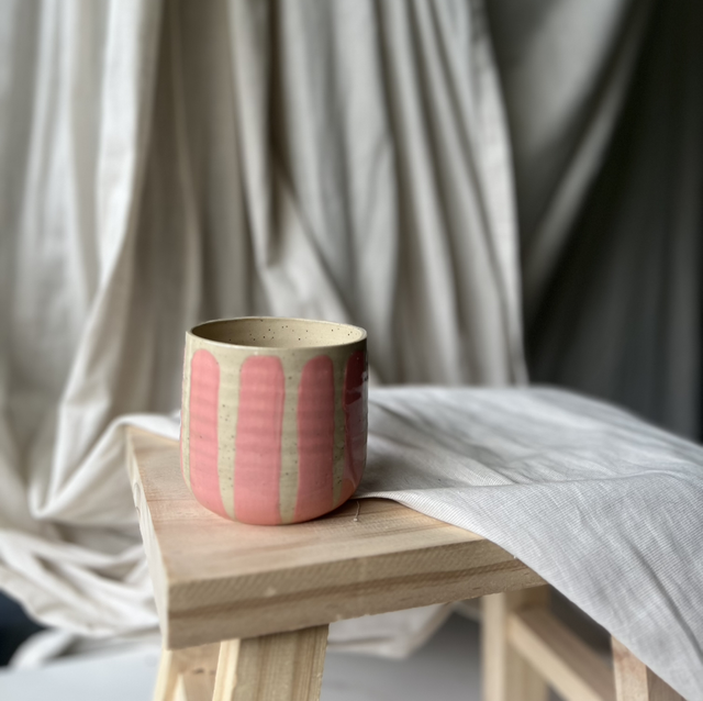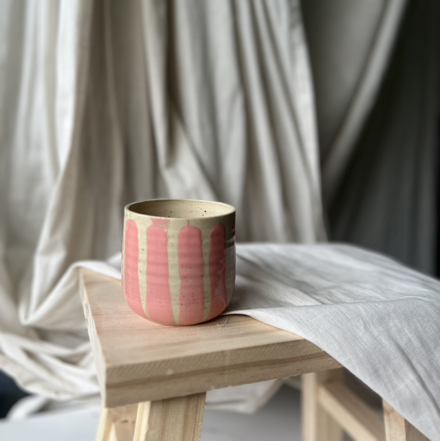 Diese Becher wurden auf einer Töpferscheibe handgefertigt, dabei wurde hochwertiger, heller Steinzeugton mit Spots verwendet. Anschließend wurde der Becher mit Engobe verziert. Durch den hohen Brennvorgang bei 1220 Grad Celsius sind alle Produkte spülmaschinengeeignet.