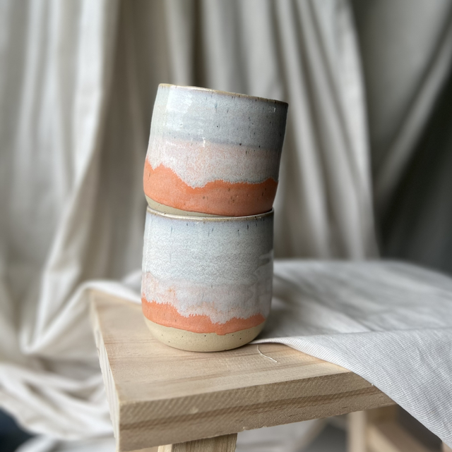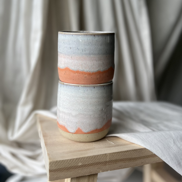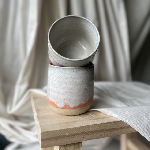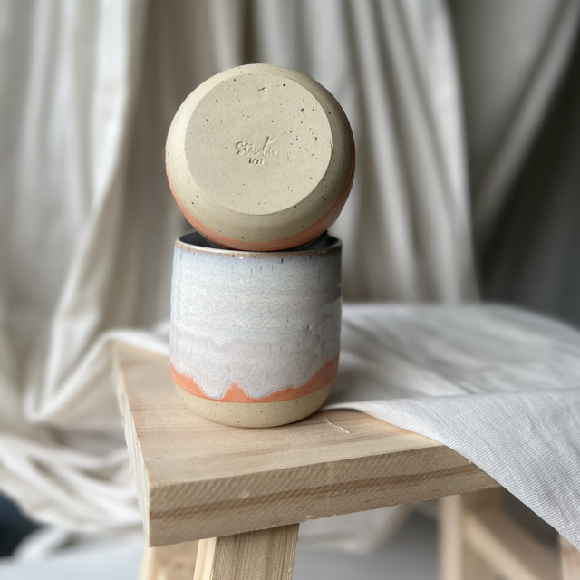 Diese Becher wurden auf einer Töpferscheibe handgefertigt, dabei wurde hochwertiger, heller Steinzeugton mit Spots verwendet. Durch den hohen Brennvorgang bei 1220 Grad Celsius sind alle Produkte spülmaschinengeeignet.