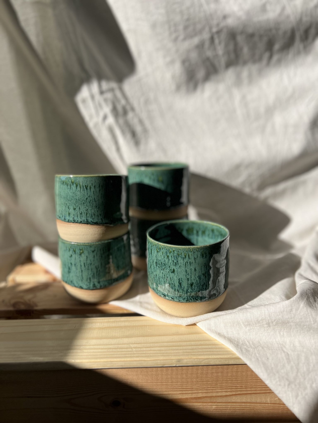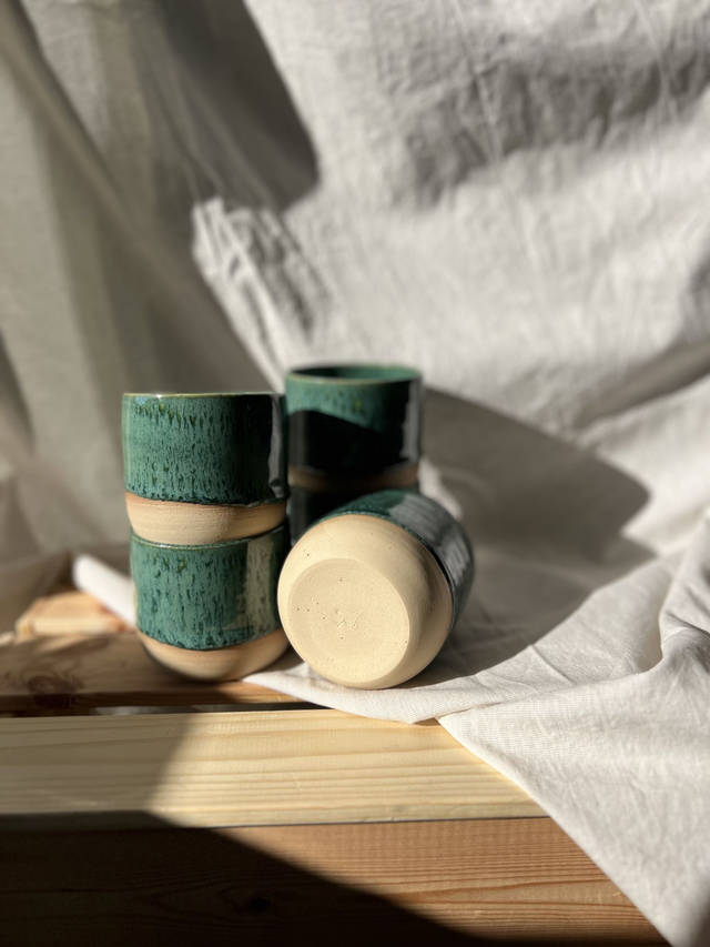 Diese Becher wurden auf einer Töpferscheibe handgefertigt, dabei wurde hochwertiger, heller Steinzeugton verwendet. Durch den hohen Brennvorgang bei 1220 Grad Celsius sind alle Produkte spülmaschinengeeignet.