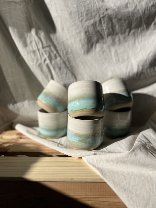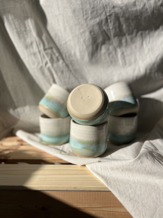 Diese Becher wurden auf einer Töpferscheibe handgefertigt, dabei wurde hochwertiger, heller Steinzeugton verwendet. Durch den hohen Brennvorgang bei 1220 Grad Celsius sind alle Produkte spülmaschinengeeignet.