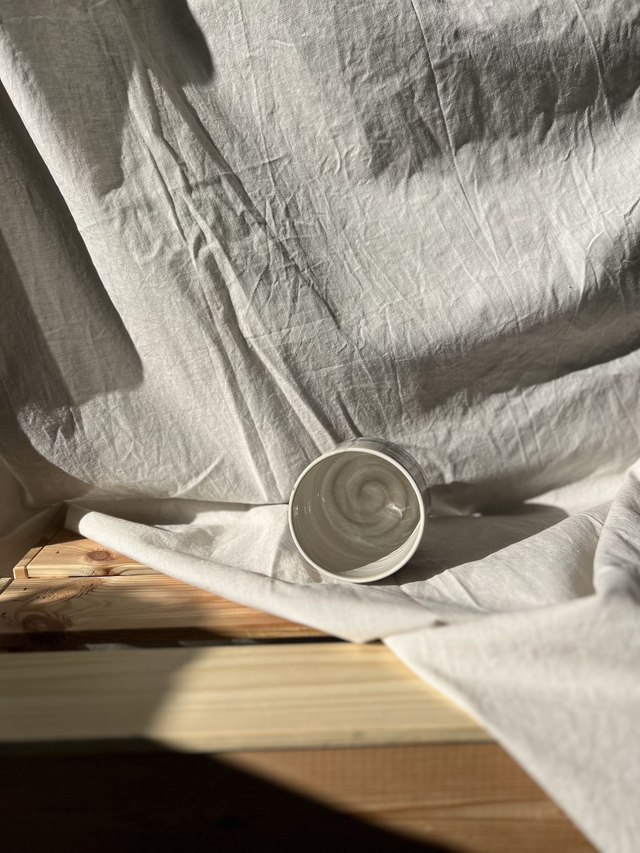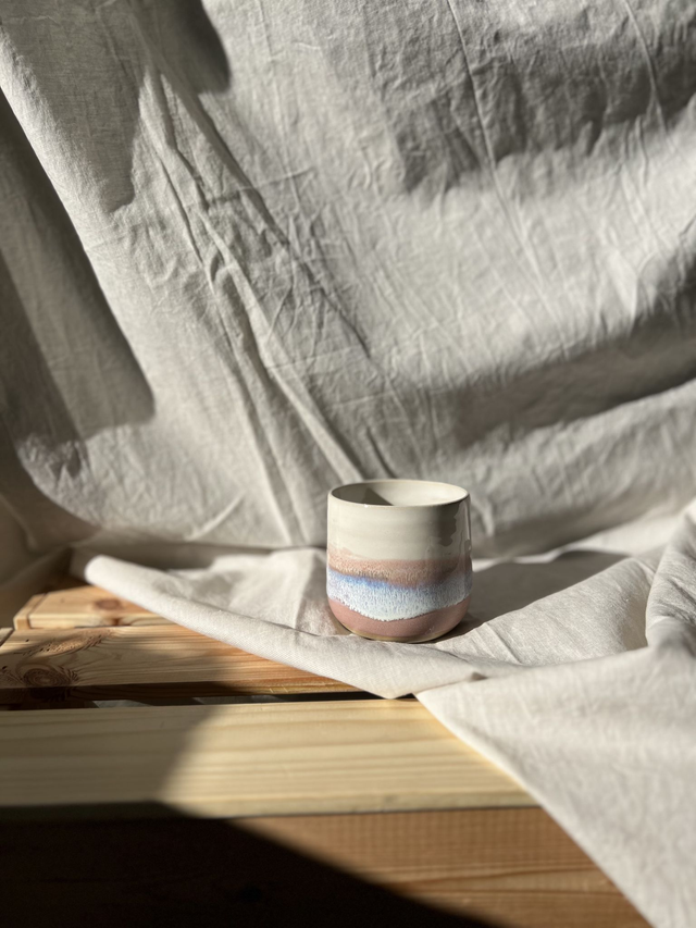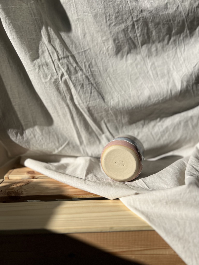 Diese Becher wurden auf einer Töpferscheibe handgefertigt, dabei wurde hochwertiger, heller Steinzeugton verwendet. Durch den hohen Brennvorgang bei 1220 Grad Celsius sind alle Produkte spülmaschinengeeignet.