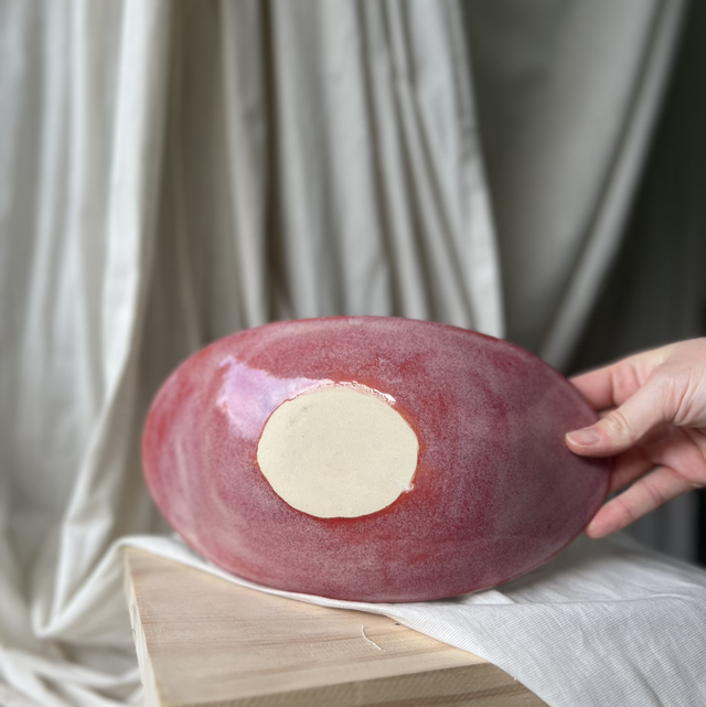 Diese elegante Schale aus Keramik wird in liebevoller Handarbeit gefertigt und mit einer feinen Glasur in knalligem Pink versehen. Die ovale Form macht sie zu einem besonderen Blickfang – modern, stilvoll und doch zeitlos.