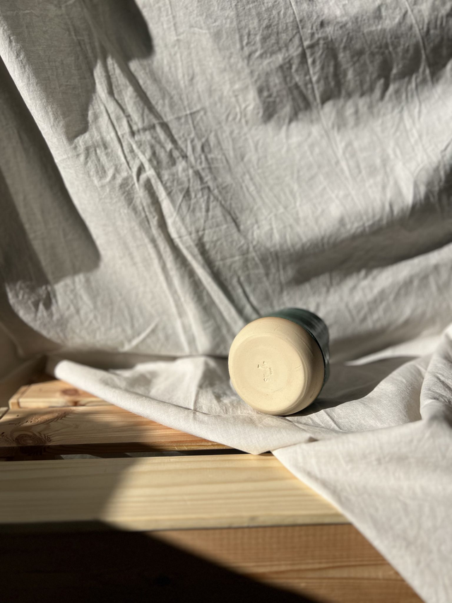 Diese Becher wurden auf einer Töpferscheibe handgefertigt, dabei wurde hochwertiger, heller Steinzeugton verwendet. Durch den hohen Brennvorgang bei 1220 Grad Celsius sind alle Produkte spülmaschinengeeignet.