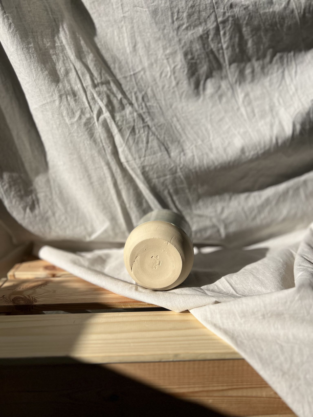 Dieser Becher wurde auf einer Töpferscheibe handgefertigt, dabei wurde hochwertiger, heller Steinzeugton verwendet. Durch den hohen Brennvorgang bei 1220 Grad Celsius sind alle Produkte spülmaschinengeeignet.