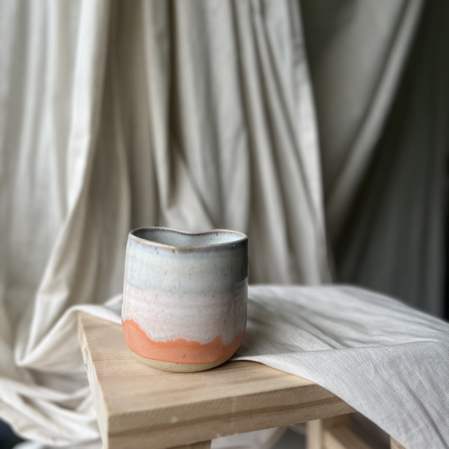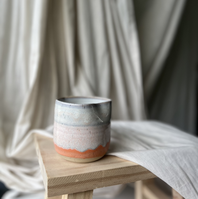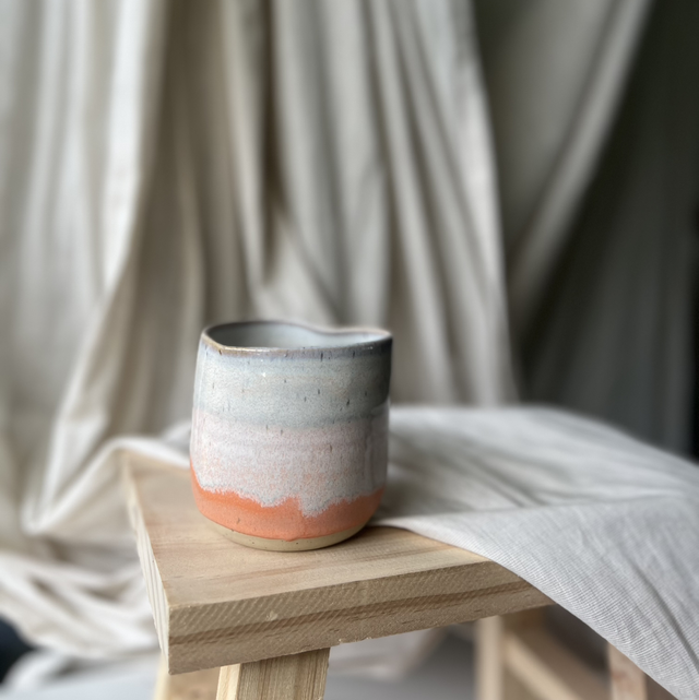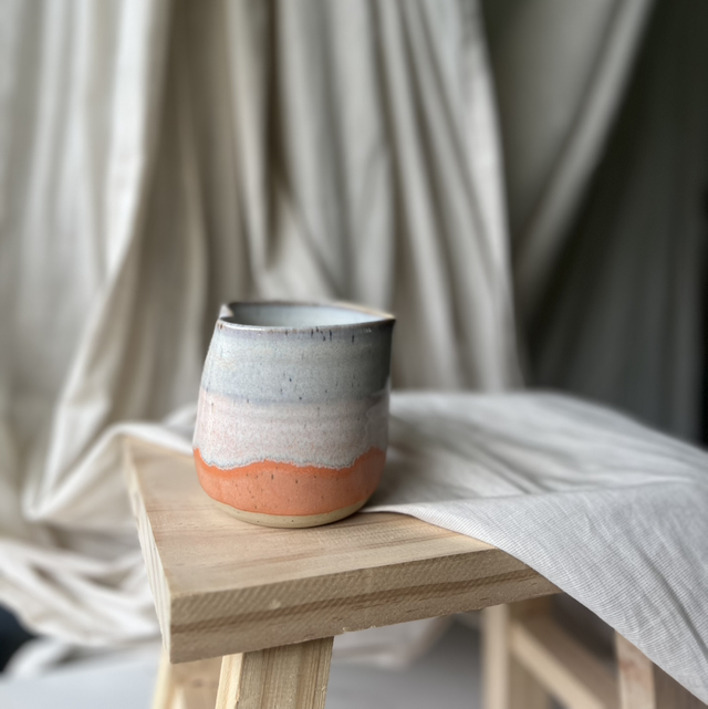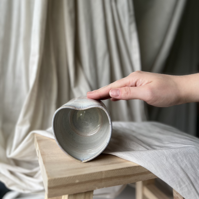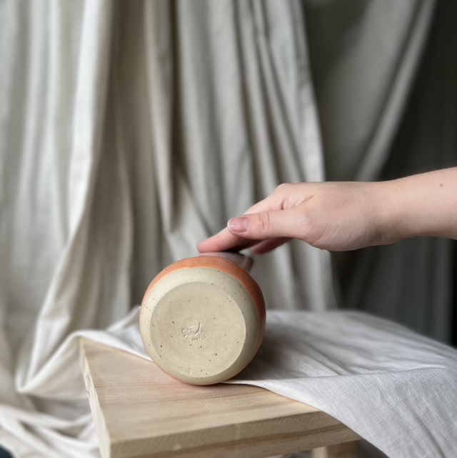 Dieser Becher wurde auf einer Töpferscheibe handgefertigt, dabei wurde hochwertiger, hell gepunkteter Steinzeugton verwendet. Durch den hohen Brennvorgang bei 1220 Grad Celsius sind alle Produkte spülmaschinengeeignet.
