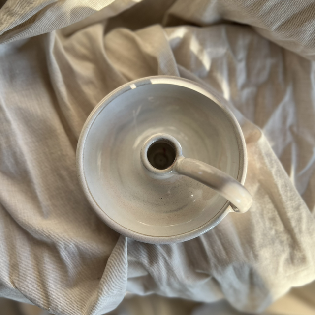 Dieser elegante Kerzenständer wird in liebevoller Handarbeit aus Keramik gefertigt. Die glasierte Oberfläche in sanften Naturtönen verleiht ihm eine zeitlose und zugleich moderne Ausstrahlung. Durch den geschwungenen Henkel mit feiner Spiralverzierung lässt er sich leicht tragen und erinnert an klassische Kammerleuchter vergangener Zeiten.