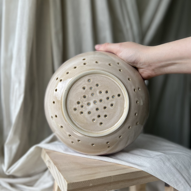 Dieses liebevoll von Hand gefertigte Keramiksieb vereint Natürlichkeit, Design und Funktion. Ideal zum Abgießen von Nudeln, Reis, Gemüse oder zum Waschen von Obst und Beeren.