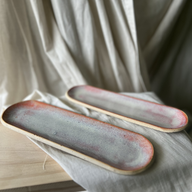 Diese eleganten Keramik-Trays sind perfekt für kleine Snacks, Nüsse, Süßigkeiten oder Häppchen. Die längliche Form macht sie ideal zum Servieren auf dem Tisch oder Buffet, während die zarte rosa Glasur jedem Arrangement eine moderne, verspielte Note verleiht.