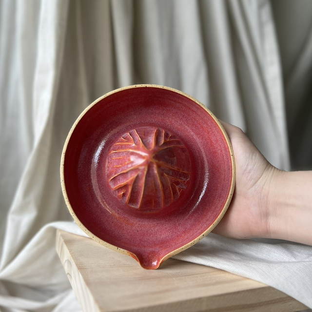 Diese Zitronenpresse aus Keramik vereint Funktionalität mit zeitlosem Design. Von Hand gefertigt und sorgfältig glasiert, ist sie nicht nur ein praktischer Küchenhelfer, sondern auch ein echter Hingucker auf dem Tisch.